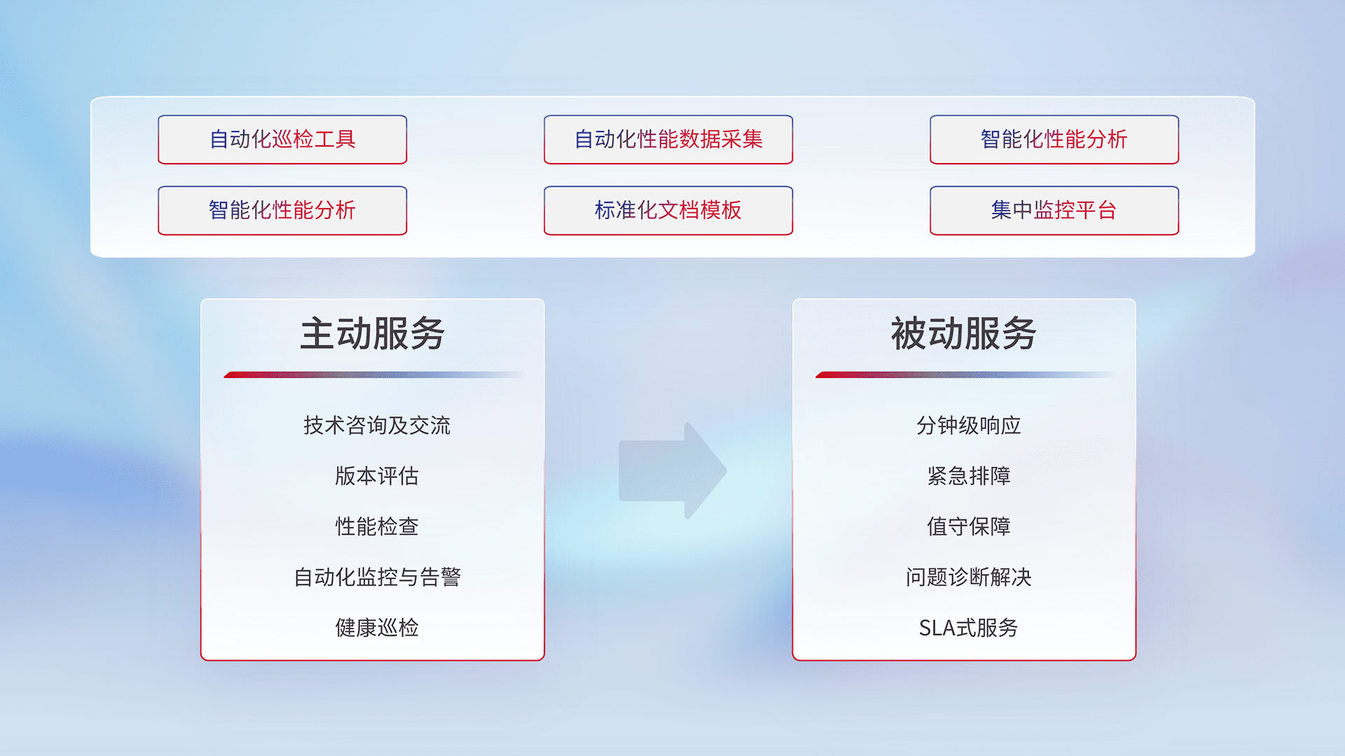 智能化工具和标准化文档,,保障服务质量,,提供主动服务(包含技术咨询、、、、版本评估、、、性能检查、、自动化监控与告警、、、健康巡检)和被动服务包含(分钟级响应、、、紧急排障、、值守保障、、、、问题诊断解决、、、、SLA服务)。。。。