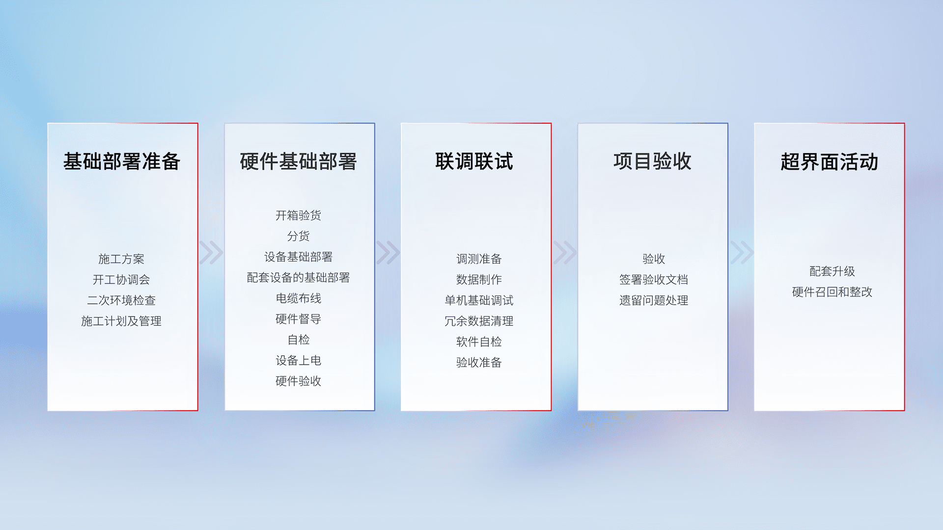 从基础部署准备、、、硬件基础部署、、、联调联试、、、、项目验收、、、越界面活动的全过程可追溯,,,保证施工质量和进度。。。